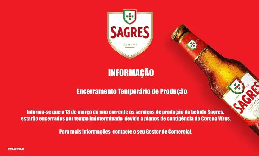 "A Cervejeira de Vialonga, do Grupo Central de Cervejas, onde é produzida a Cerveja Sagres, desmente esta informação falsa e de má fé, de que a sua produção esteja suspensa devido ao Covid-19", acrescenta nesse comunicado Nuno Pinto de Magalhães, Diretor de Comunicação e Relações Institucionais do grupo cervejeiro.