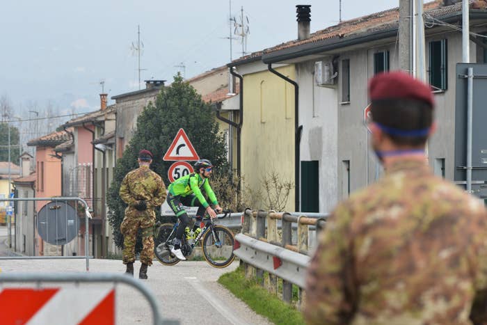 Soldados italianos patrulham em um posto de controle na entrada da pequena cidade de Vo Euganeo, situada na zona vermelha do surto de coronavírus no norte da Itália.