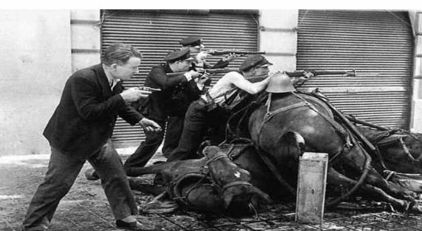 Foto de Agustí Centelles, mostrando como uma milícia operária usa um cavalo morto como barricada DR